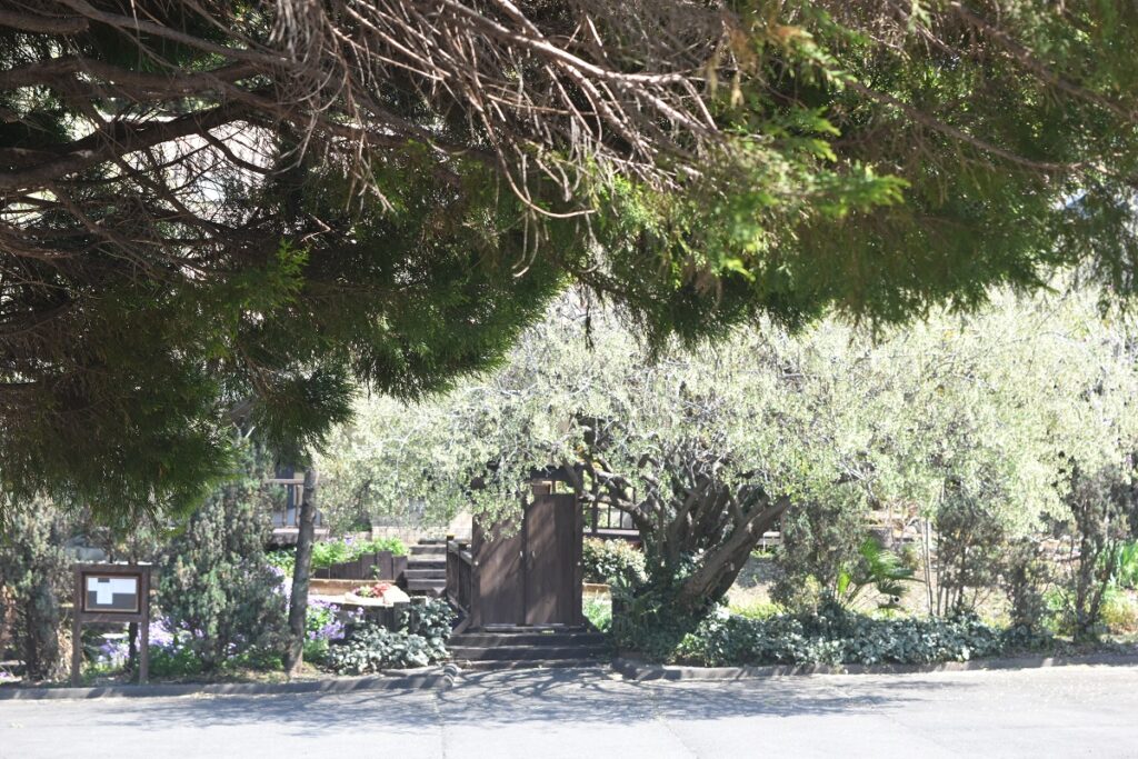 ゴールドクレスト(電信柱ほどの高さのある大きな木)がお店入り口への目印。