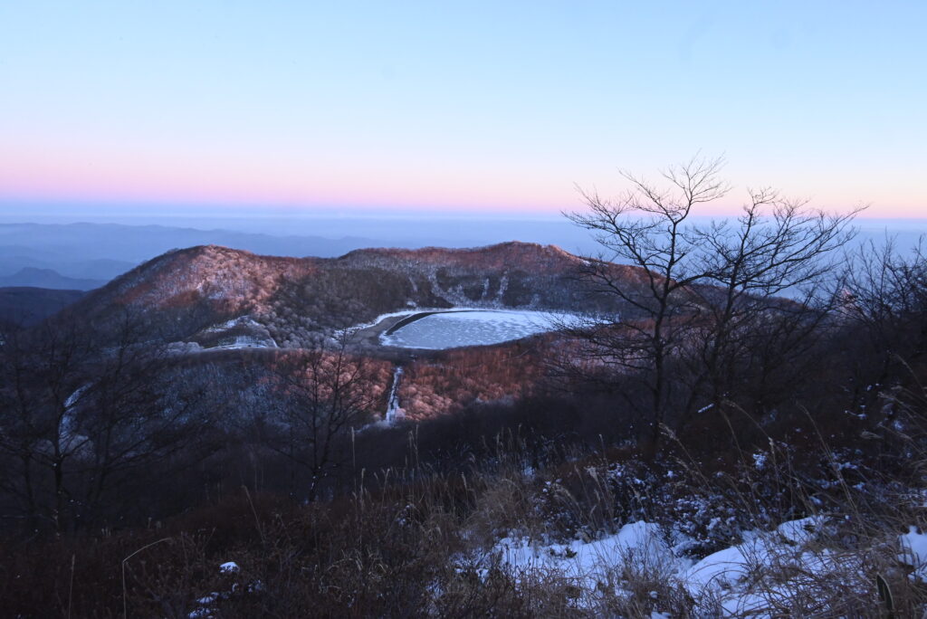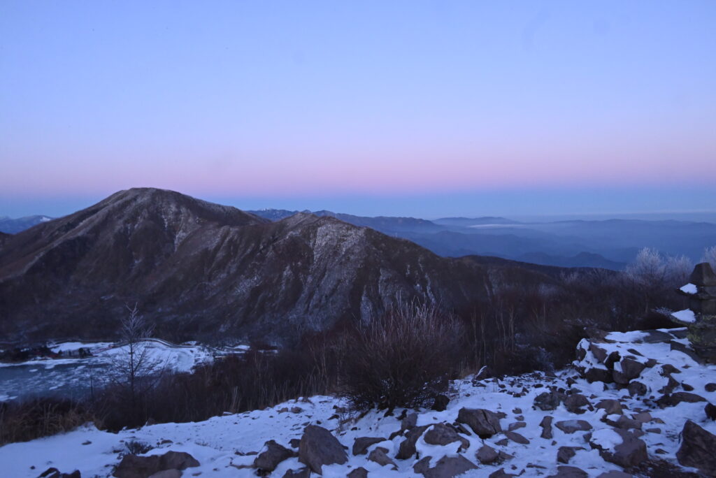 夕暮の地蔵岳から 小沼の上の東の空はビーナスベルト 今年は昨年より雪が少ない 今のところ 小沼は何とか結氷してアイスバブルも見られるようです