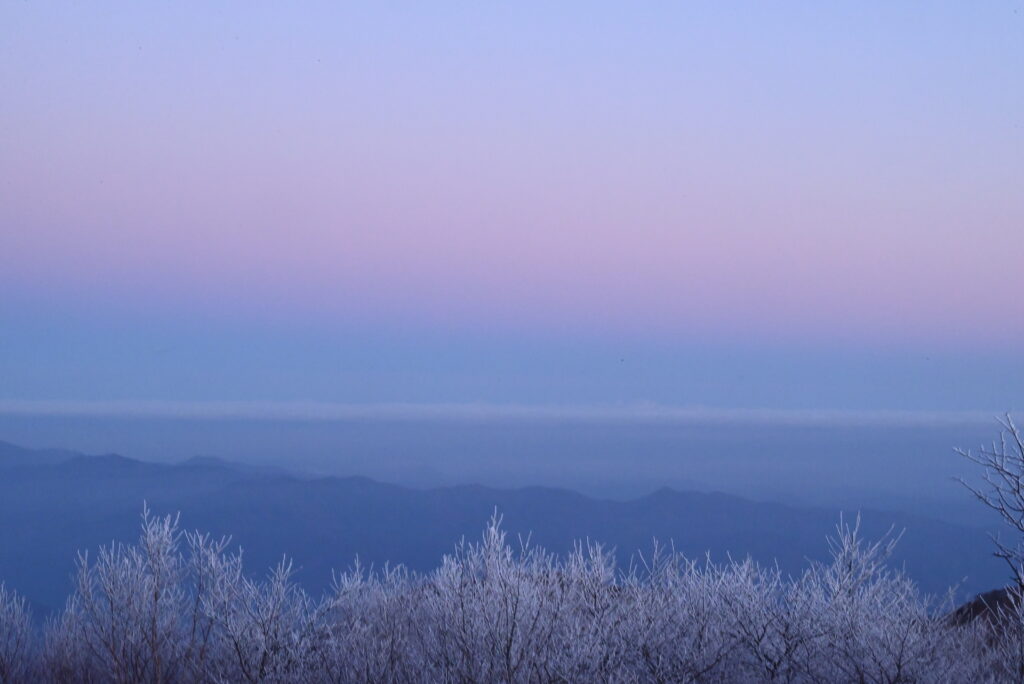 「ビーナスベルト」日没時 太陽と反対の東の空に見えるピンクの帯 その下の青い部分は地球の影「地球影」です 昼と夜の堺と言ってよいのかな 雪山で見るとトリコロールですね