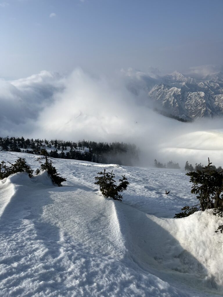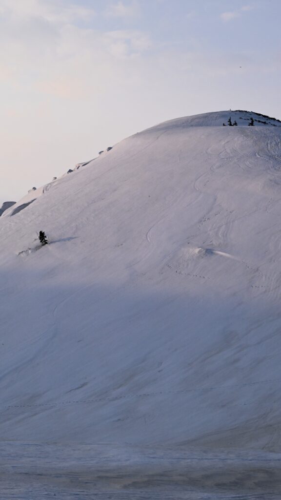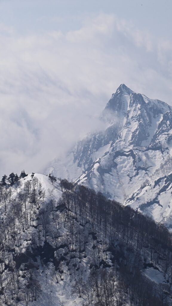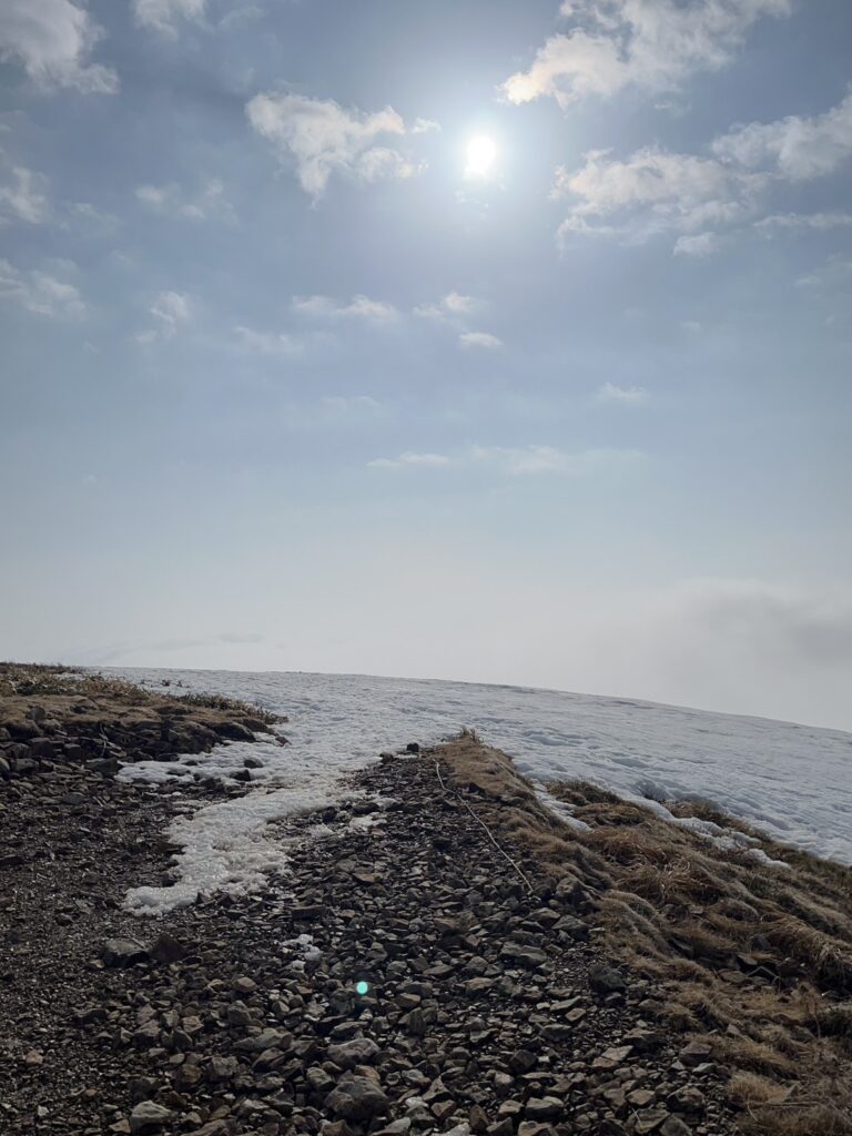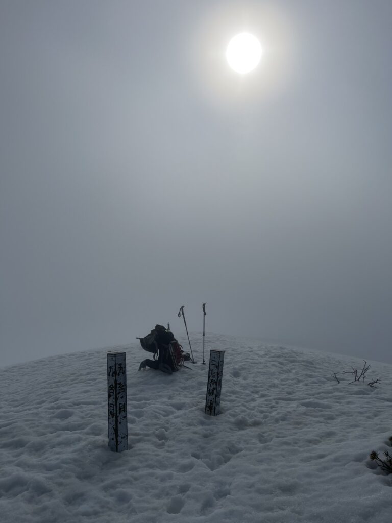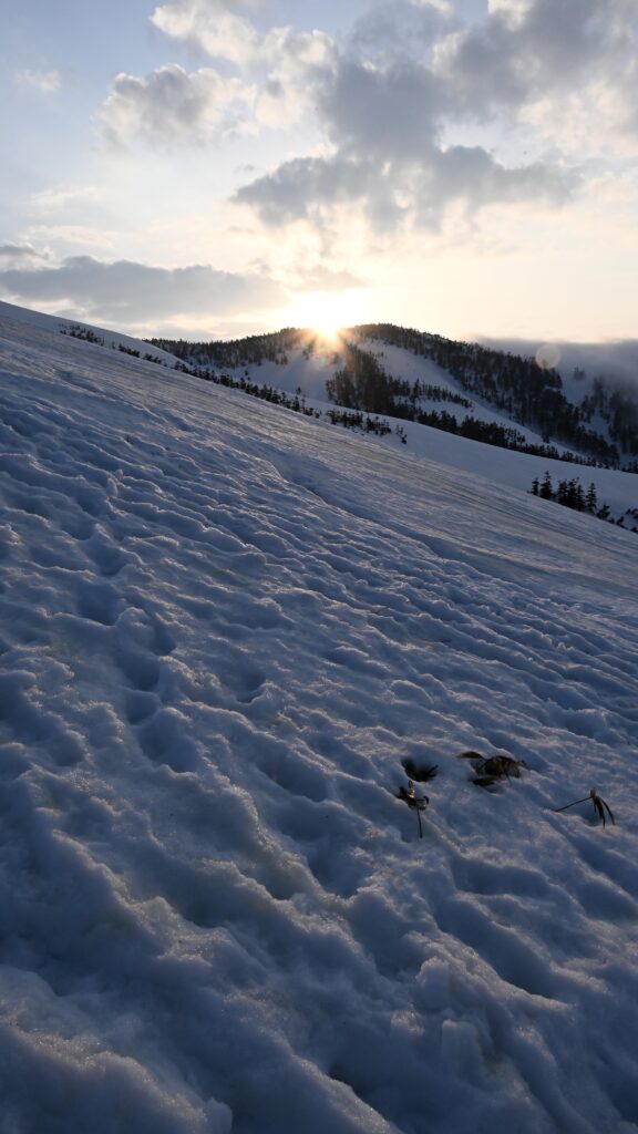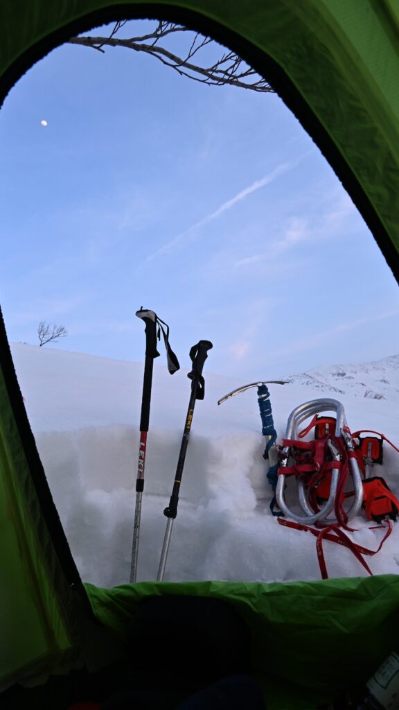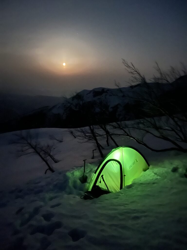 巻機山の登山口はまだ雪で開設していないので車は国道291号の道脇に止めて登ります 冬は余計に歩かなくてはいけなく標高差1400mを登ります 歩き出しが正午だったので日帰りはできず途中でテント泊となりました ちょうど下山の時間と重なり降りる人とすれ違うばかりです 日曜日の残雪期の巻機山車は20台くらいでした 日没前にテント設営を終えるために1500mの大変眺めの良いところに建てました 今日は無風で薄雲を通して月が見えています