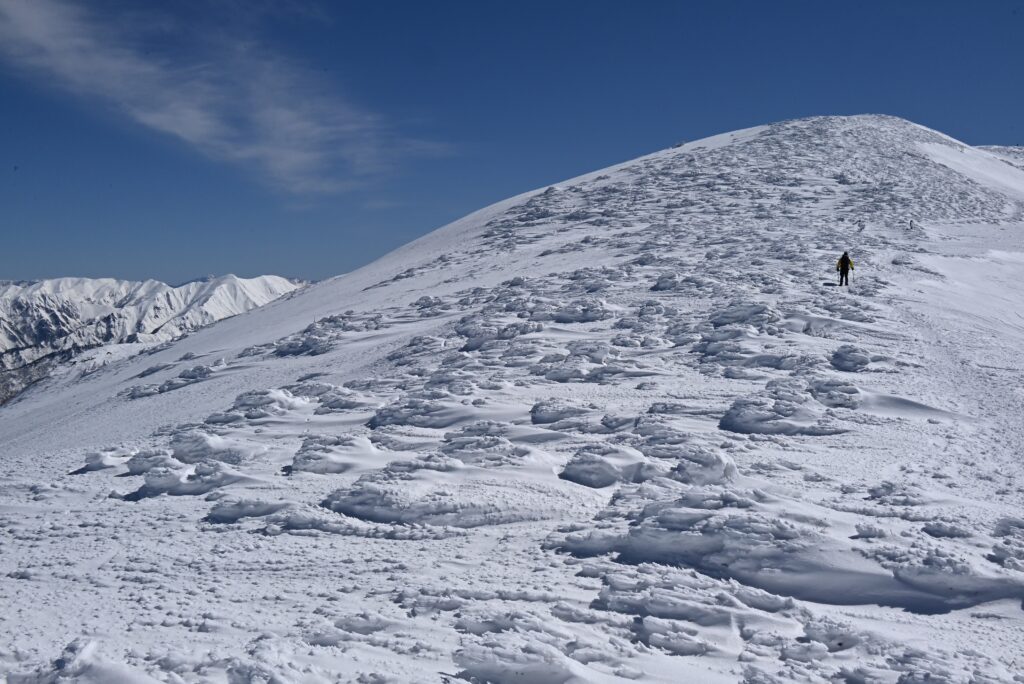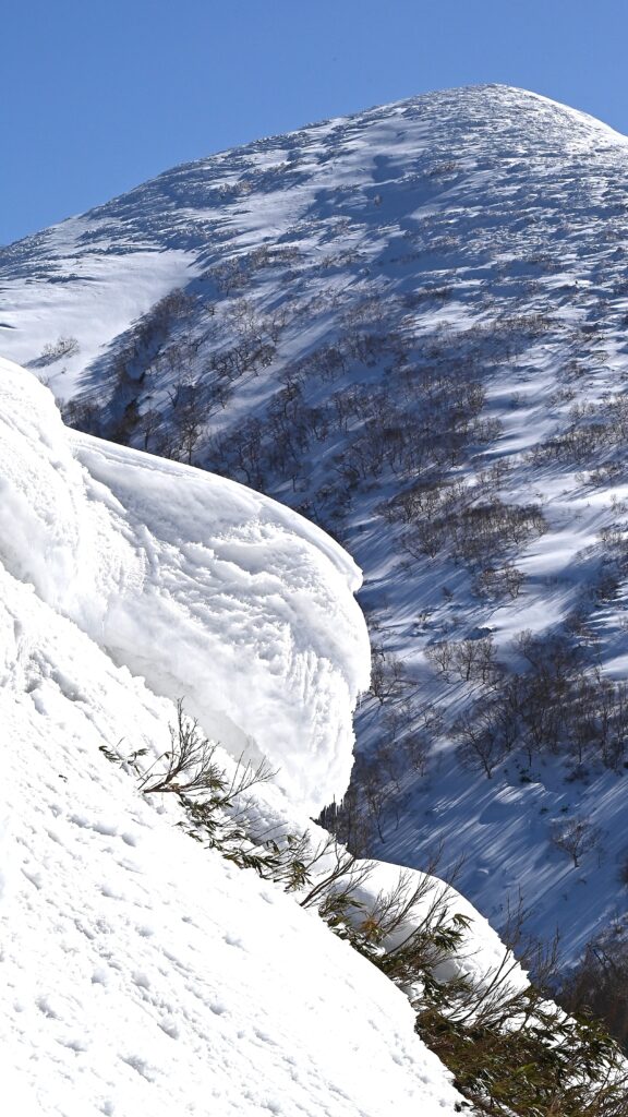 松手山手前から9合目の標識のあるピークを見上げる 左の雪庇は松手山の標識のある山頂ですが深い雪に覆われ何も見えません