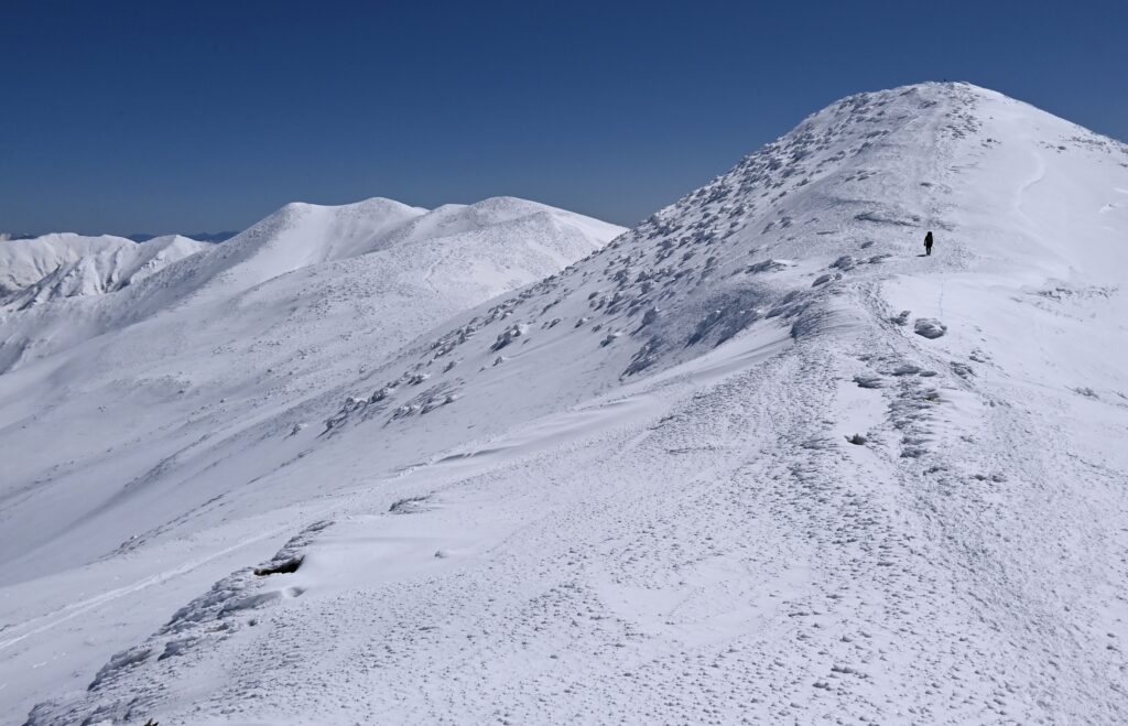 右の山が平標の山頂です 左のなだらかなピークが仙ノ倉岳です このあたりで標高が一番高く2026mです この数字のおかげか今年の冬特に登る人が多くなった気がします 山頂の標識には2026.2と書いてあります これにこだわった方もおられるようです 地図によっては2026.3mと書いてあるものもあります