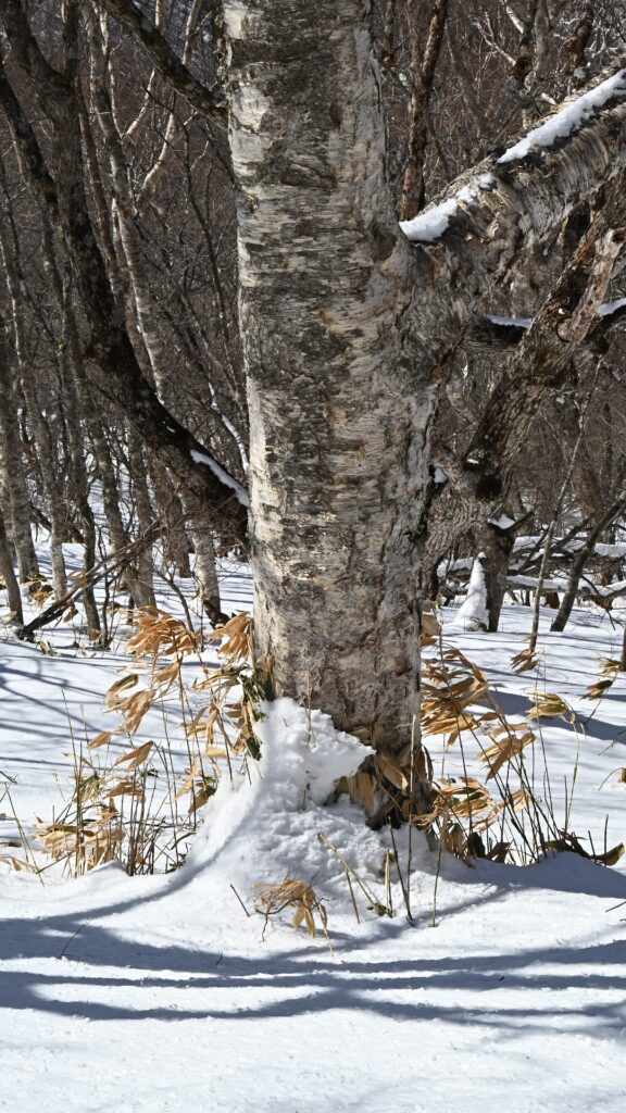 まだ雪たっぷりの平標山 写真は標高1500m付近の樹林帯で撮ったもの 光がなんとなく暖かくなってきているのが感じられます ダケカンバと笹ですかね