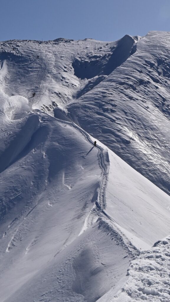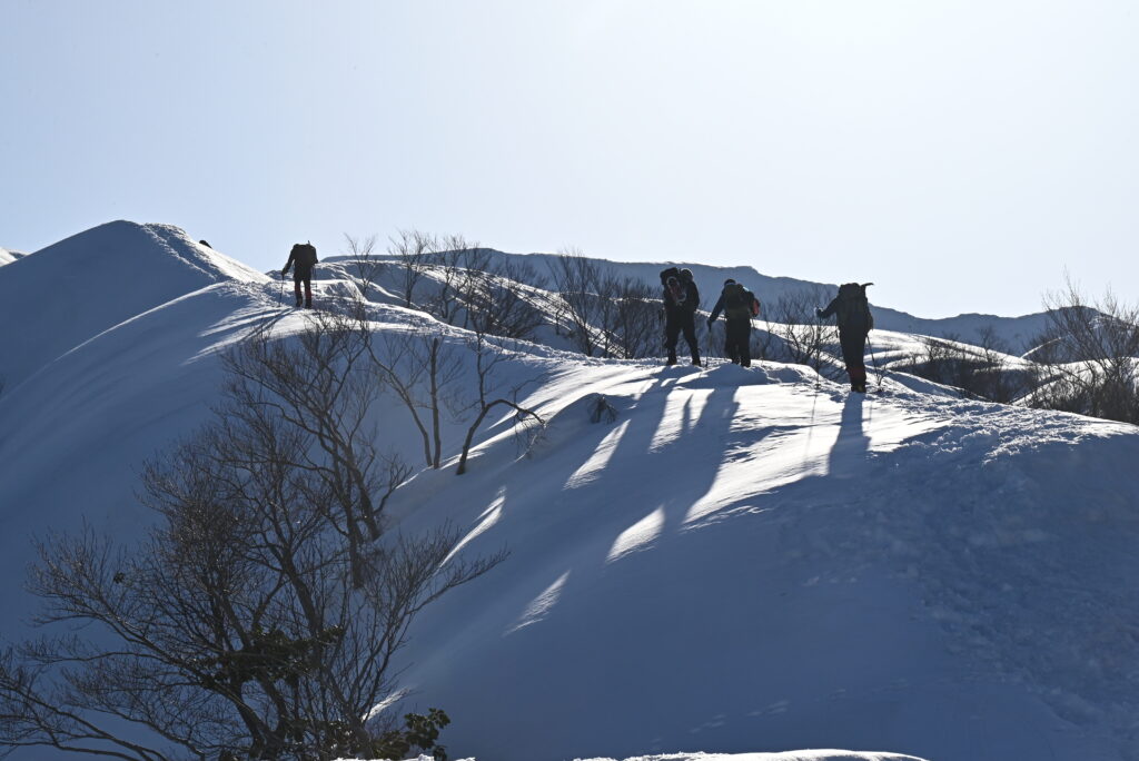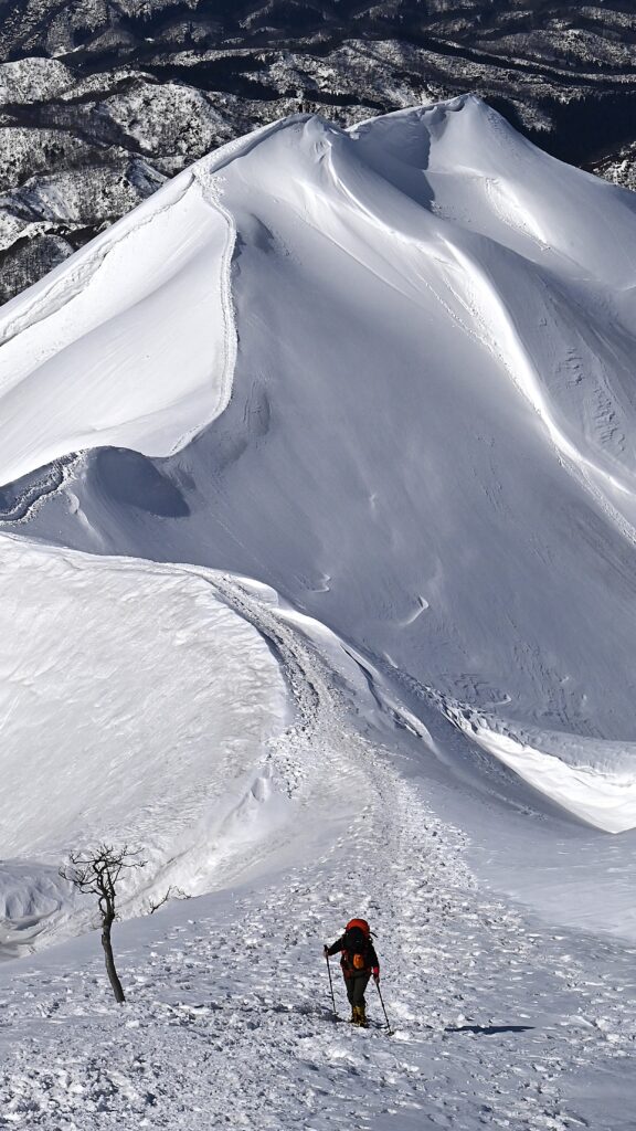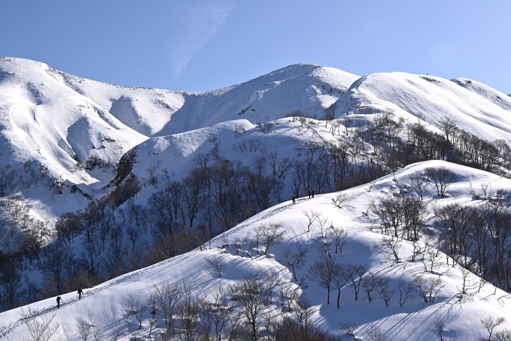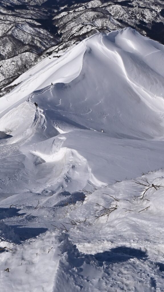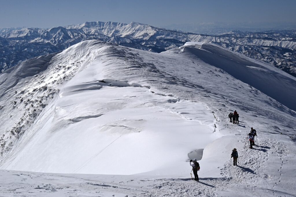 稜線の向こうに東洋一の雪庇と言われる守門岳が見える 登山者も多くトレースが出来晴れた週末はこの景色を求めて県外からも多く訪れます
