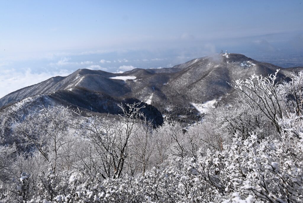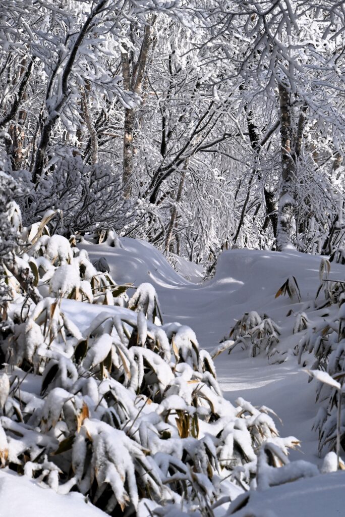 山頂に続く尾根に出ると日が射し 霧氷の回廊を進みます 冬の赤城の見どころは霧氷と大沼のアイスバブル 本日は青空に霧氷です